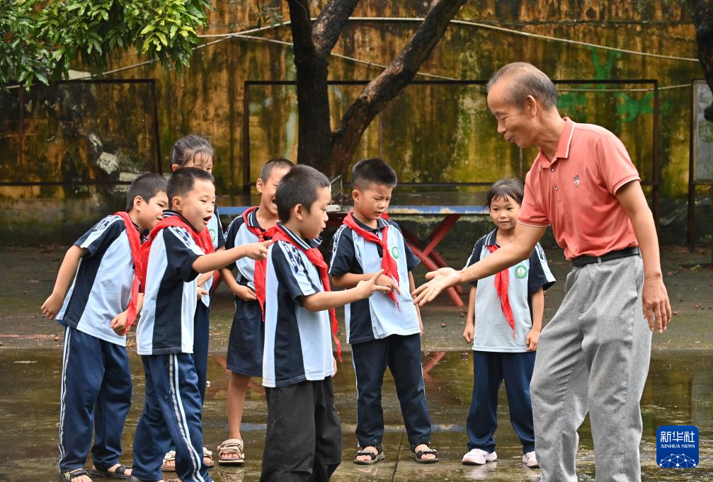 9月9日,在广西宾阳县王灵镇中心学校七新教学点,王英红老师课间和学生做游戏。