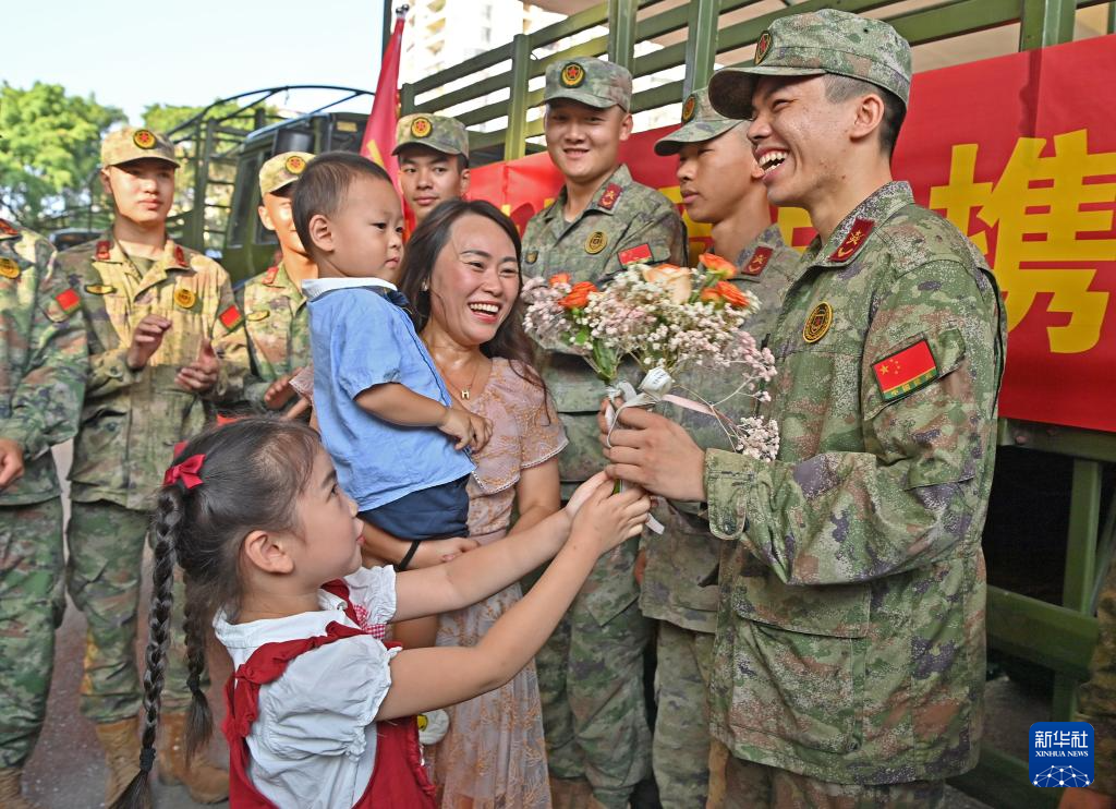 10月12日,小朋友在向参与救援的民兵献花。