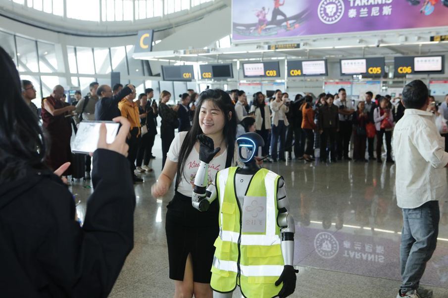 活动现场,AI机器狗“笨笨”以“科技向导”的身份开启巡场互动,其灵动的姿态、友好的互动模式以及定制礼品派送服务,赢得旅客们的喜爱。随后,人形机器人伴随音乐表演机械舞和传统武术,大家纷纷用镜头记录下精彩瞬间。“AI遛狗挑战赛”“机器人舞蹈battle”“AI合影打卡”等特色活动接连开展。同时,机器人变身为“民航专家”,向旅客普及航空安全知识,进一步丰富了活动的科普内涵。