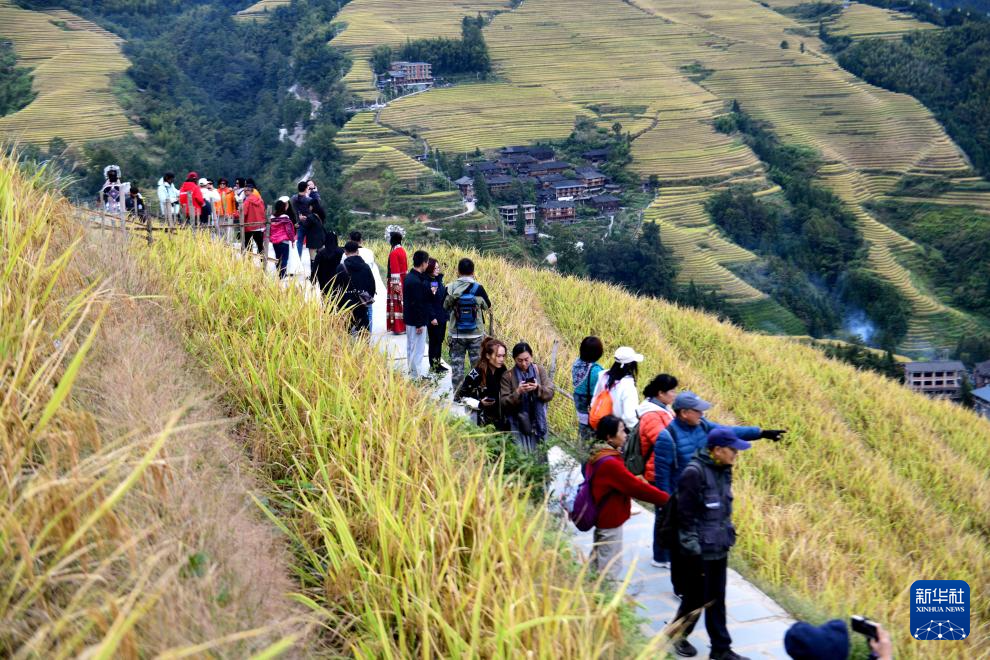 眼下,广西龙胜各族自治县龙脊梯田一片金黄,成为众多游客观光“打卡”的热门景点。龙脊梯田已有2300多年历史,是联合国粮农组织认证的全球重要农业文化遗产。