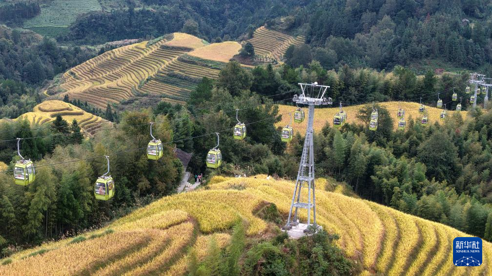 10月22日,游客乘坐缆车在广西龙胜各族自治县龙脊梯田观光(无人机照片)。