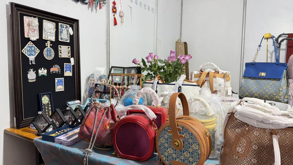 工艺精湛的壮锦服饰、款式时尚的壮锦包包、图案精美的壮锦饰品……在活动现场,一家摆满各式各样壮锦元素产品的展位格外吸睛。据参展商介绍,此次展出的产品均由广西工艺美艺研究院有限公司研发、生产,该公司共设计开发了壮锦非遗系列的少数民族织锦日用品、旅游产品、室内软装产品等40多个系列300多款。