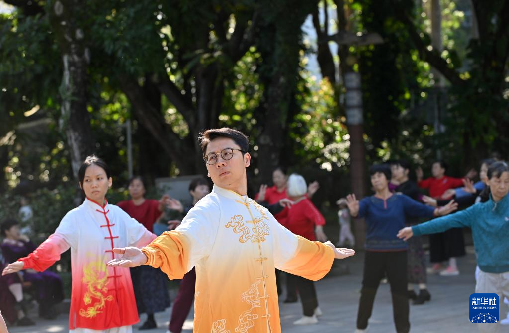 11月14日,在广西南宁市金花茶公园,医务工作者为市民演示八段锦。