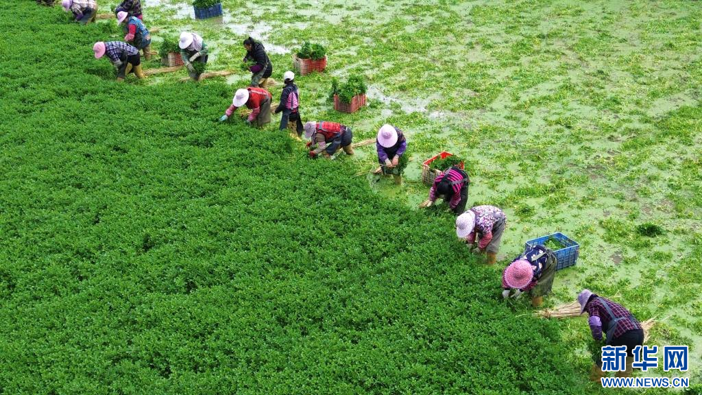 11月19日,广西壮族自治区贺州市平桂区沙田镇道东村农民在采收蔬菜(无人机照片)。