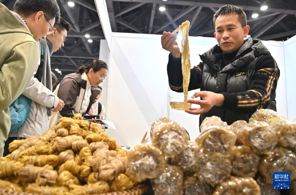 1月24日,在广西南宁国际会展中心,一名参展商在年货大集上展示红薯粉条。