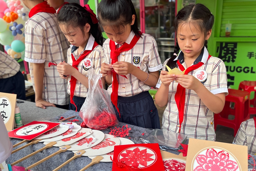 长堽小学的同学现场制作剪纸作品。黎洪威 摄