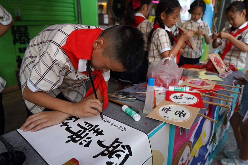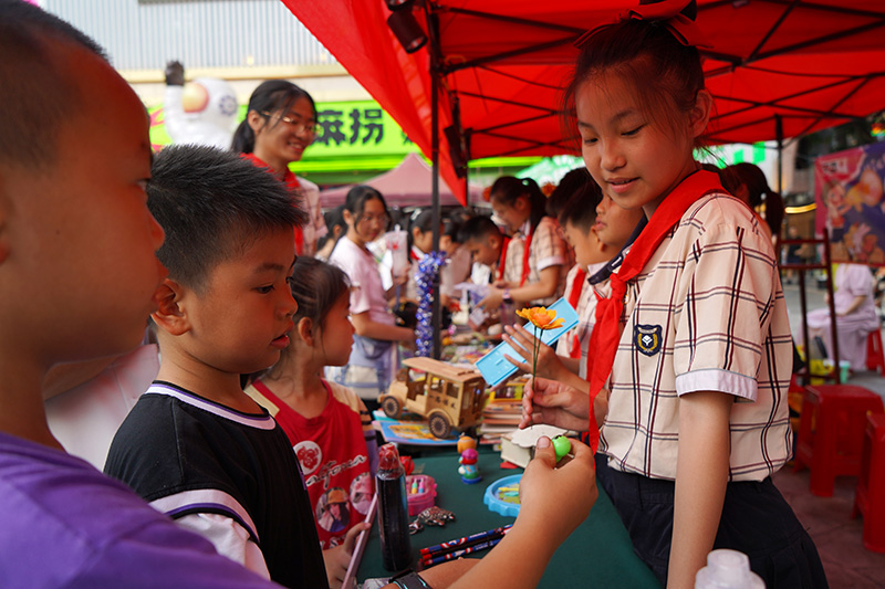 活动现场,内街文化创意园与长堽小学联合举办了“情暖‘六一’,爱在‘义’起”红领巾壮苗义卖集市,摊位前人头攒动、爱心涌动。