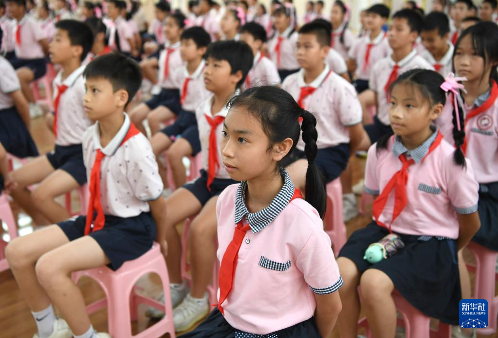 6月6日,学生们在广西南宁市玉兰路小学学习无接触式眼保健操。