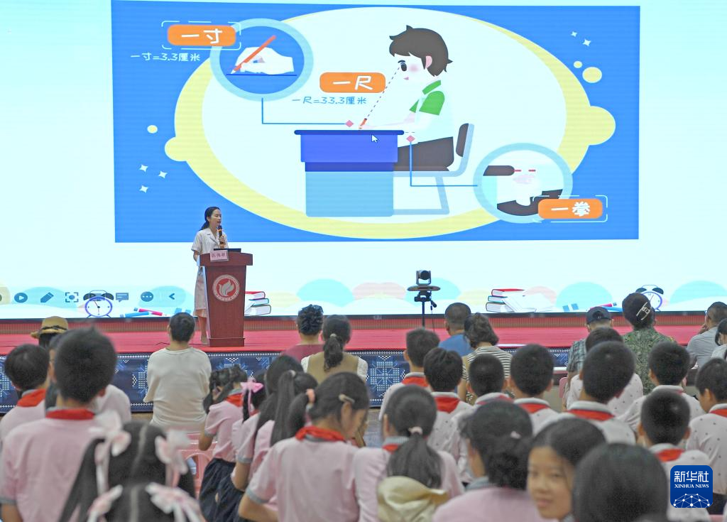 6月6日,眼科专家在广西南宁市玉兰路小学为学生们科普眼保健知识。