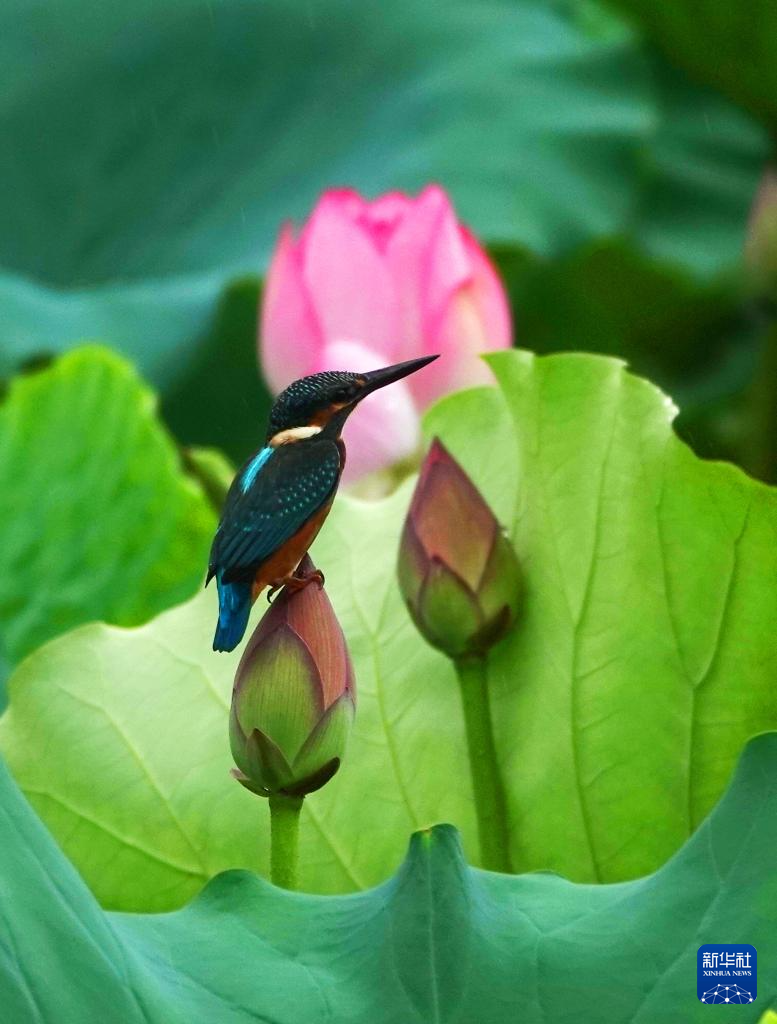 6月9日,一只小鸟在广西南宁市青秀山景区荷塘的荷苞上停留。