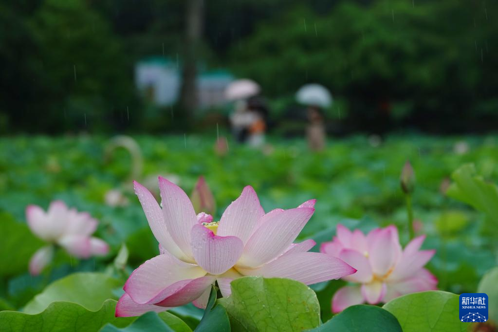 6月9日,游人在广西南宁市青秀山景区欣赏雨中荷花。
