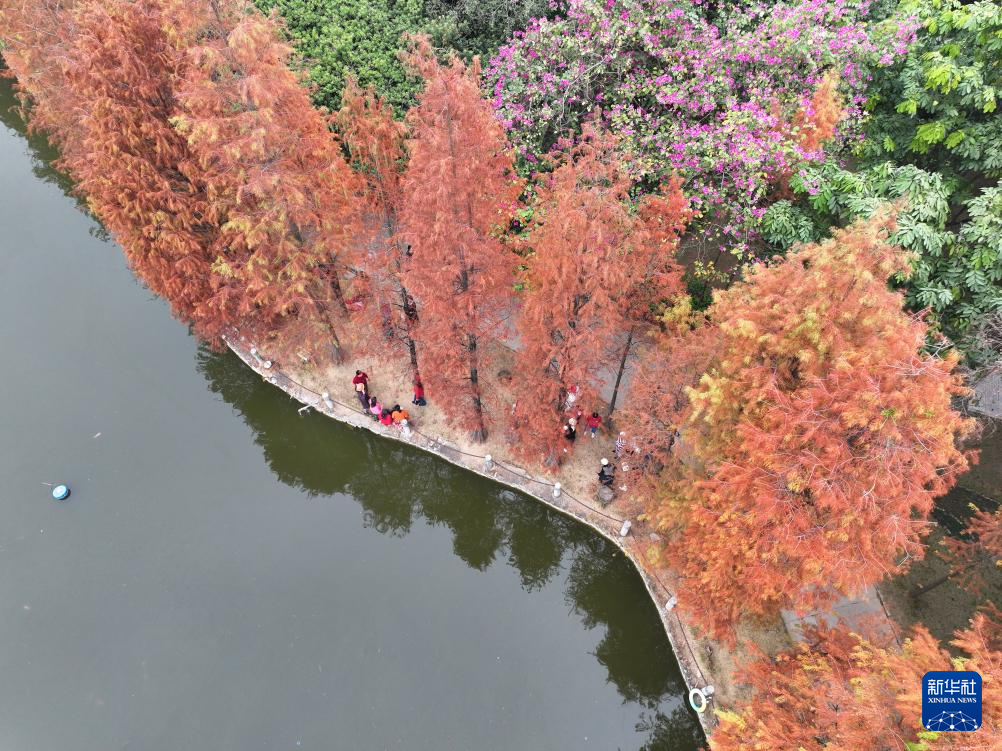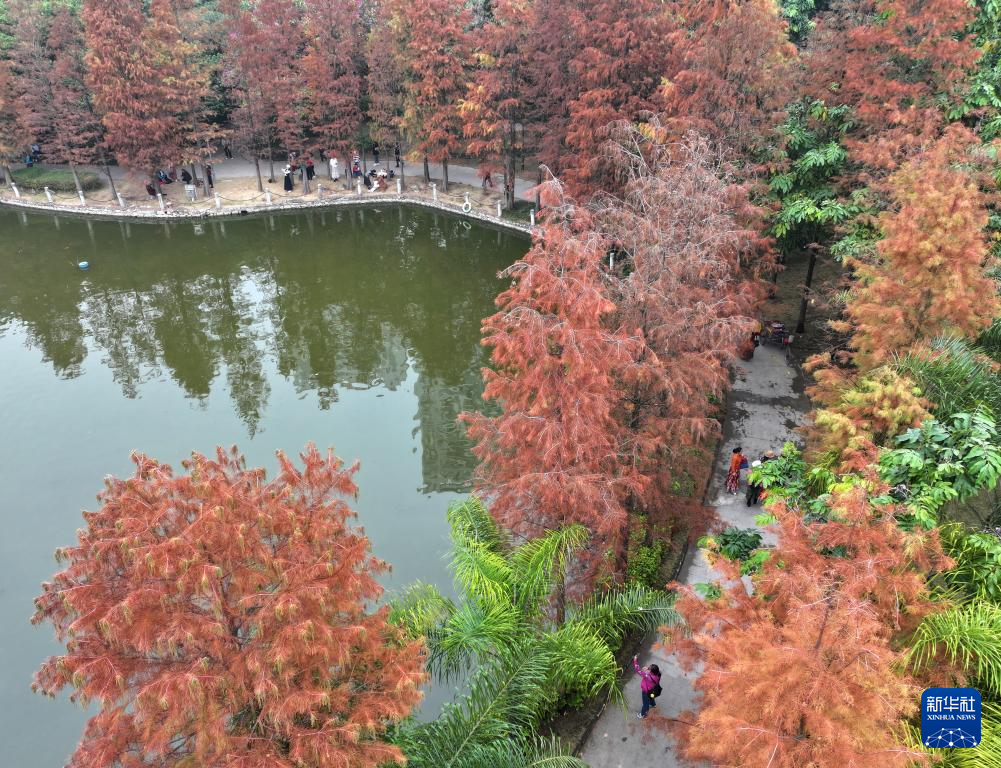 时下,广西南宁市多个公园的杉树“披”上红装,吸引了众多市民前来观赏。