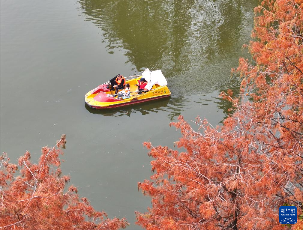 市民在广西南宁市金花茶公园内红艳的杉树林旁划船(1月6日摄,无人机照片)。