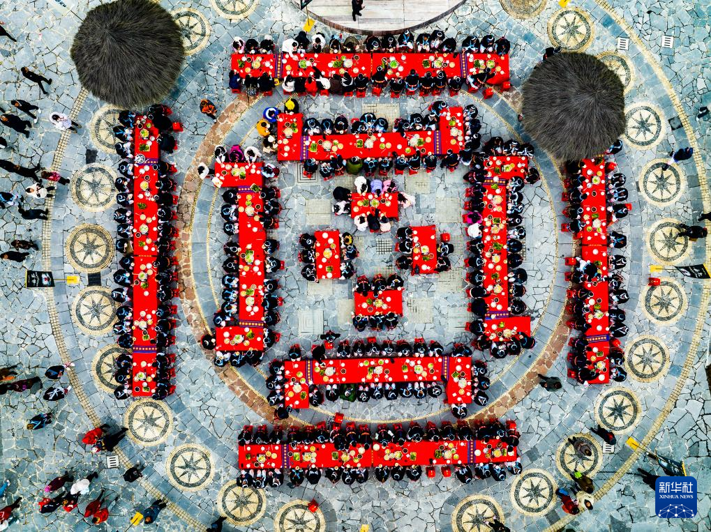 2月23日,白裤瑶群众和游客在南丹县里湖瑶族乡瑶望天下景区参加“瑶王印宴”(无人机照片)。