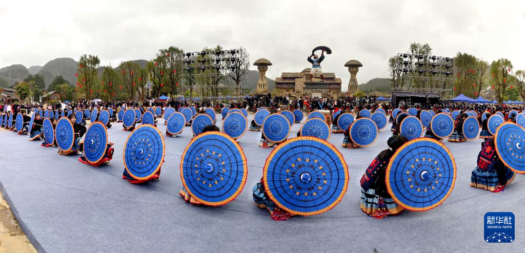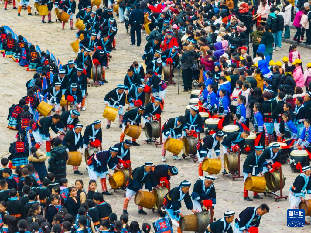 2月23日,白裤瑶群众在南丹县里湖瑶族乡瑶望天下景区敲响迎宾铜鼓(无人机照片)。