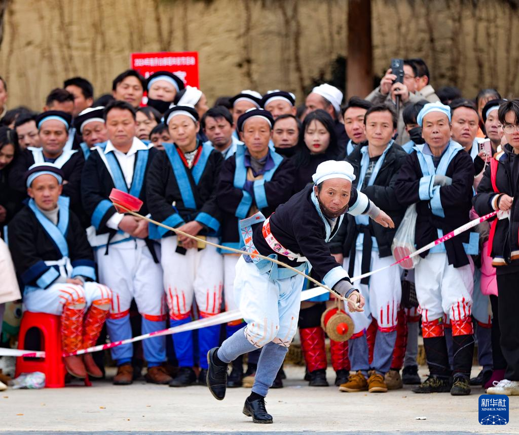 2月23日,白裤瑶群众在南丹县里湖瑶族乡瑶望天下景区表演舞蹈。