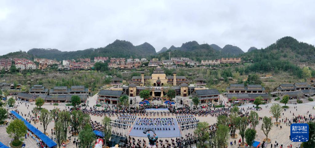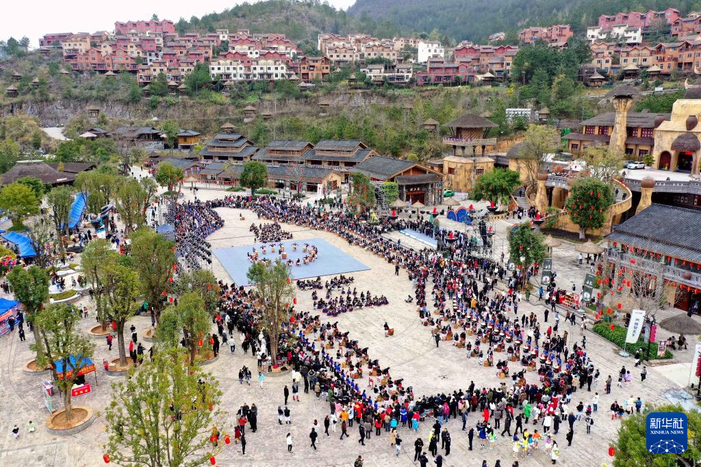 2月23日在南丹县里湖瑶族乡瑶望天下景区拍摄的千鼓颂春年街启动仪式(无人机照片)。