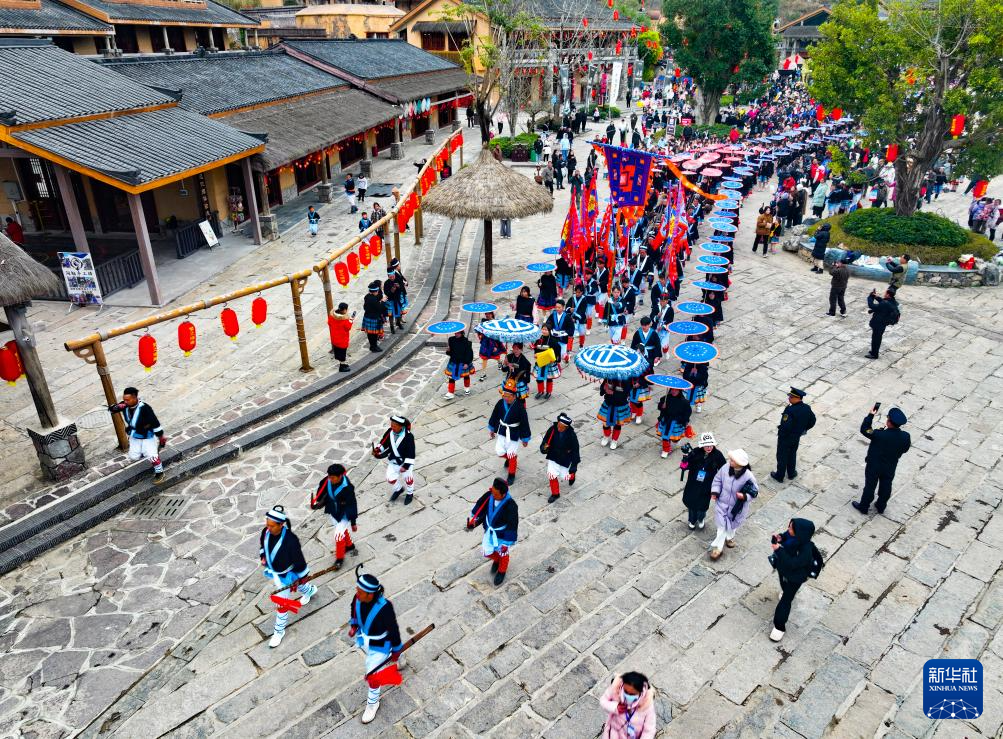 2月23日,白裤瑶群众在南丹县里湖瑶族乡瑶望天下景区进行瑶王巡寨非遗项目展示(无人机照片)。