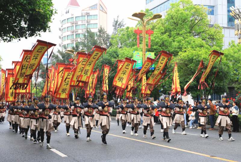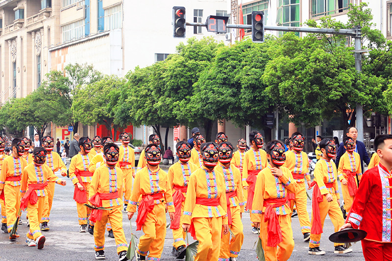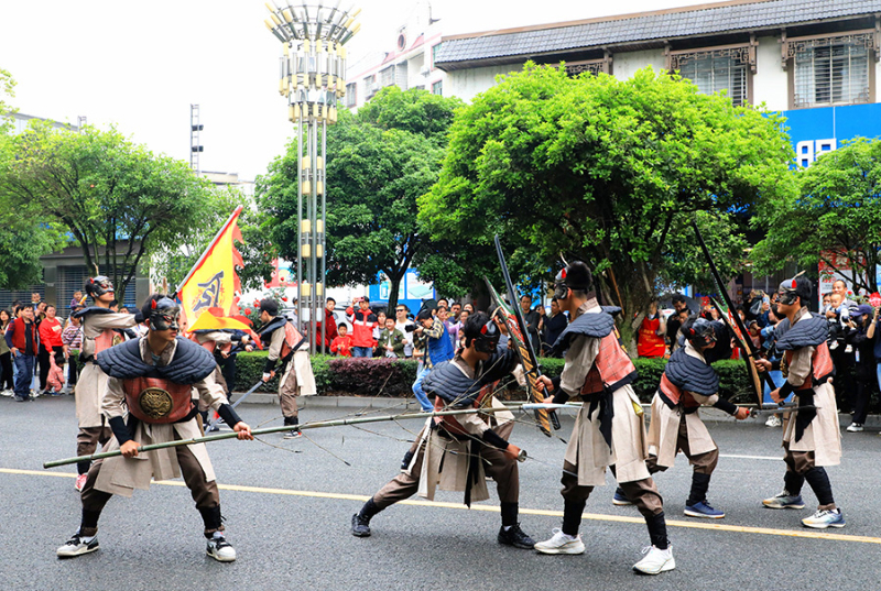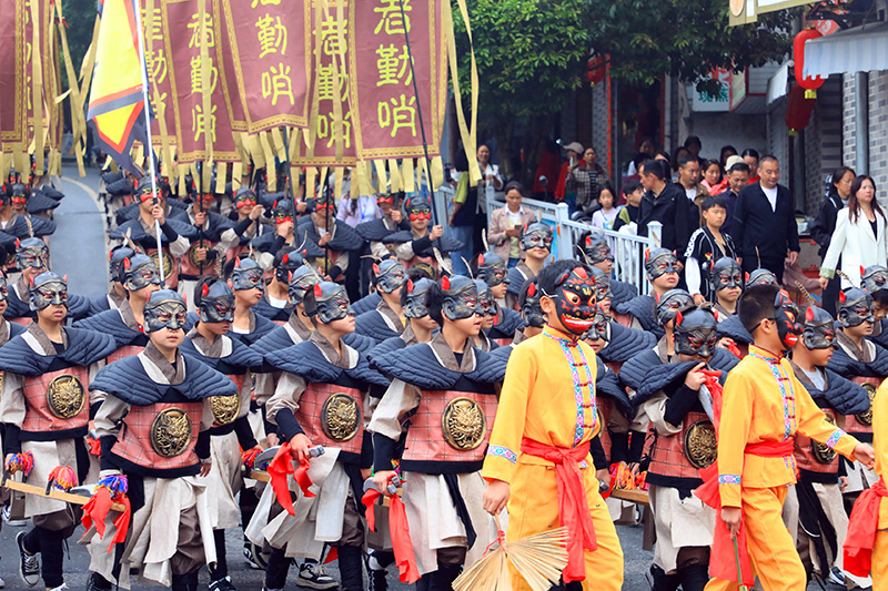 巡游由800多人的狼兵武术传承人、令旗、板鞋双刀、狼叉、镰刀、狼拳、火铳、板狮、战鼓11个方阵及6个哨旗方阵组成。队伍浩浩荡荡、锣鼓铿锵,17个表演方阵各具特色、精彩纷呈,轮番沿路进行表演。