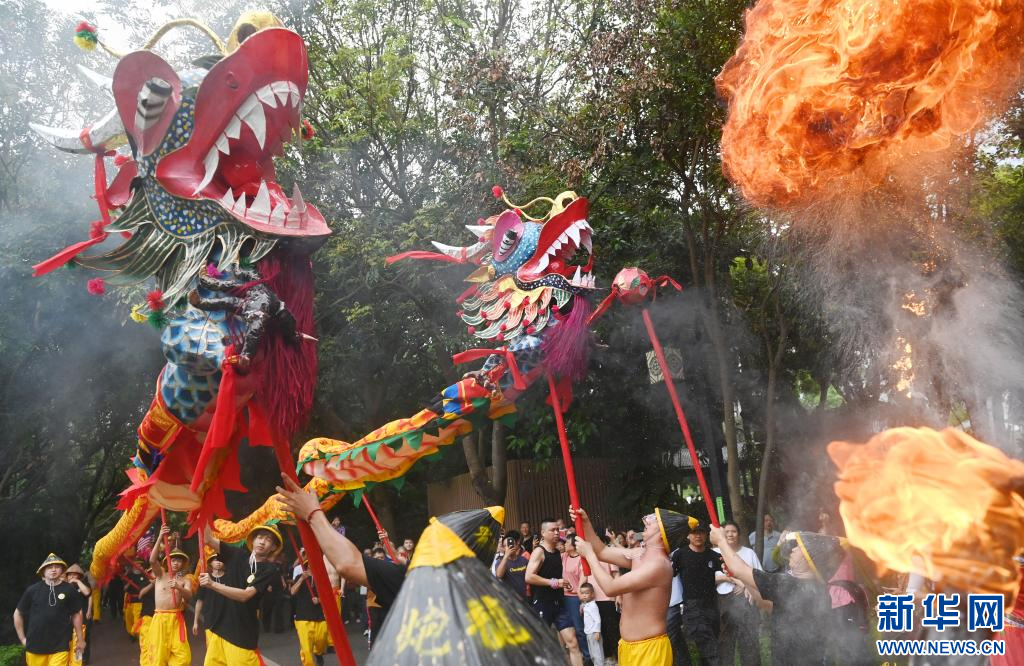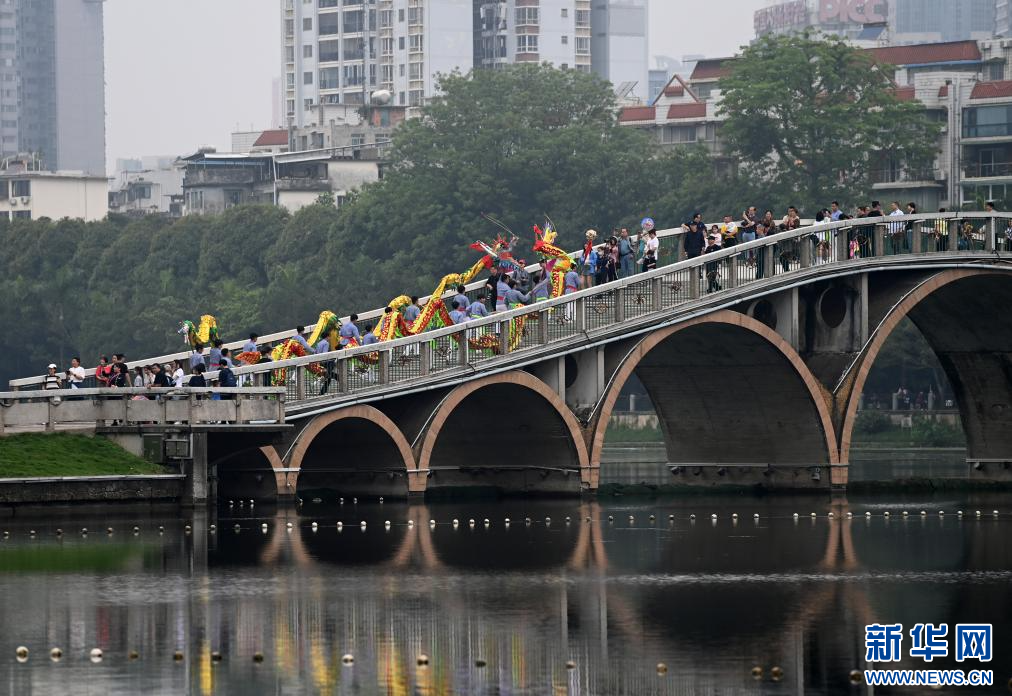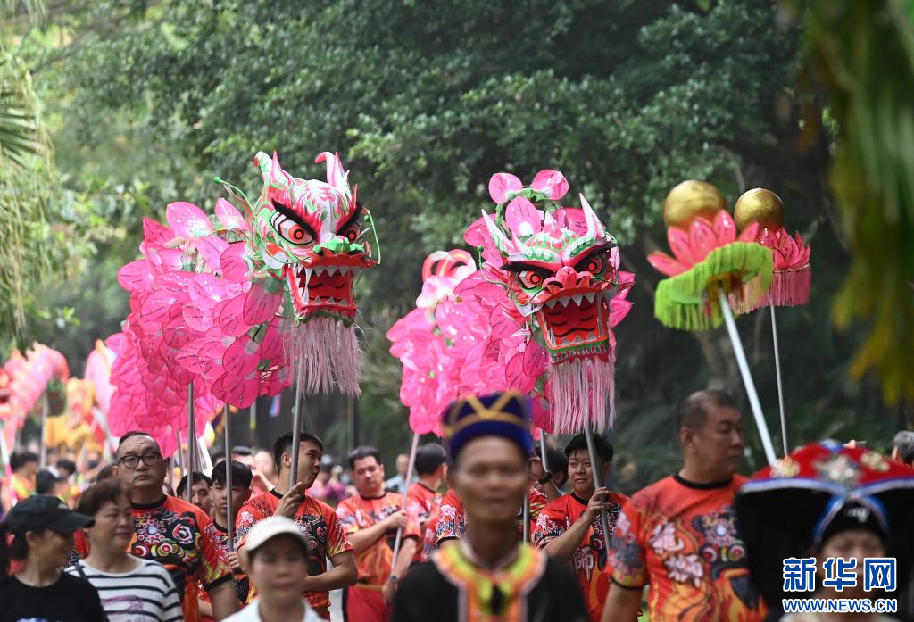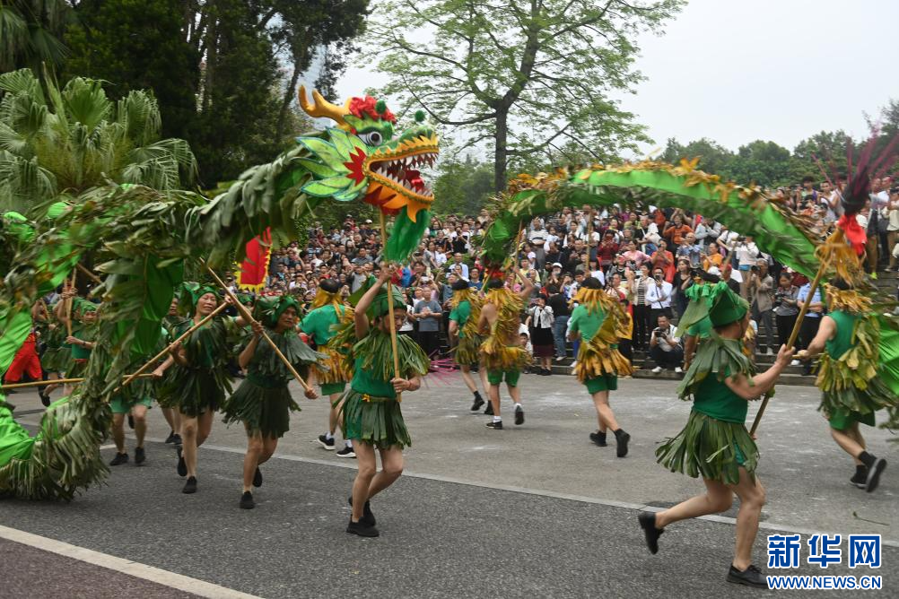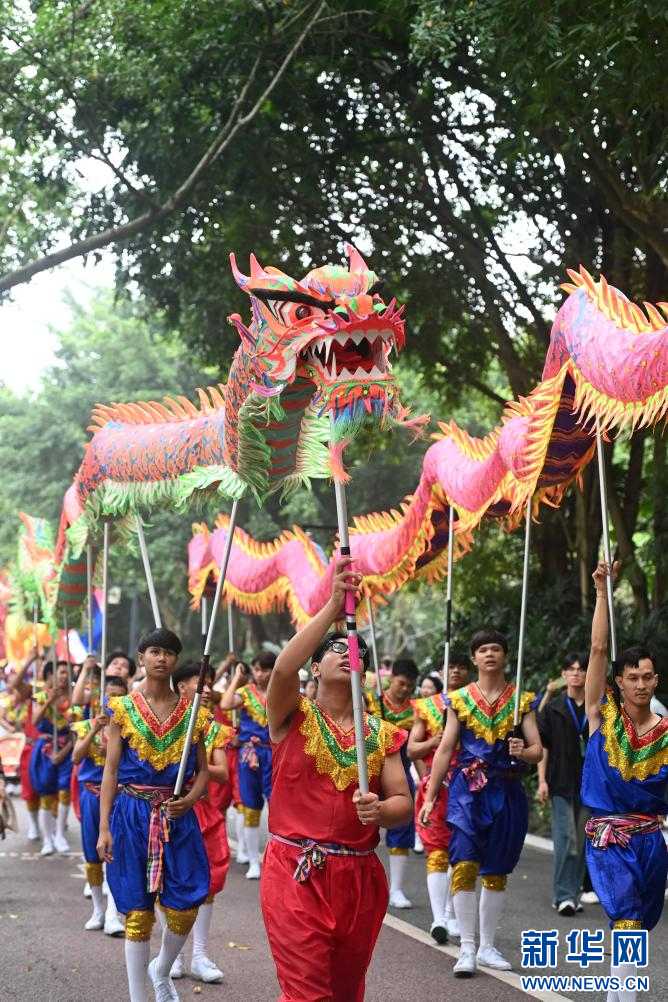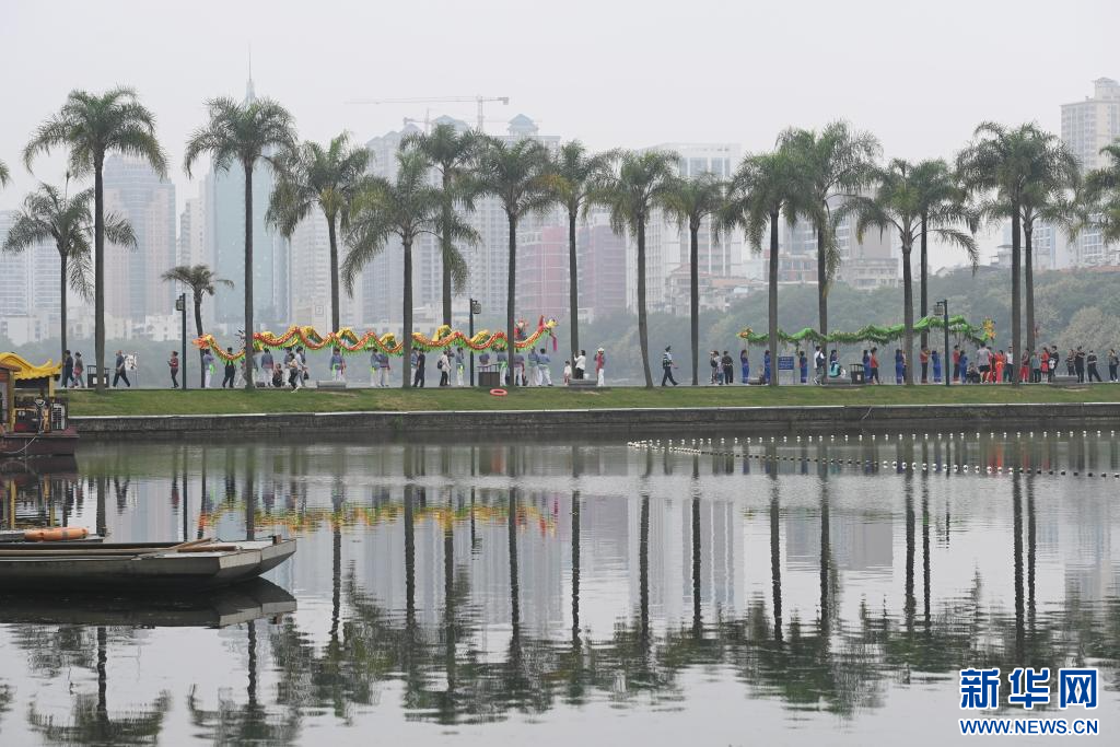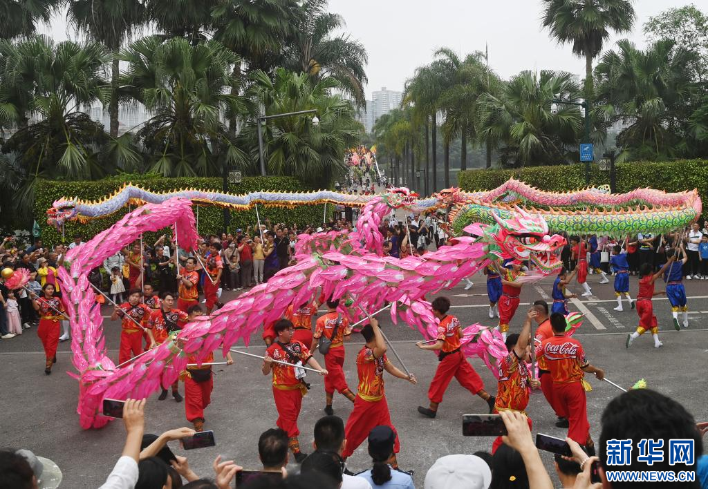 4月12日,舞龙队在广西南宁南湖公园巡游。