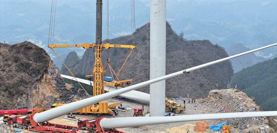 广西华电河池南丹山口200MW风电项目风机安装现场(沙颜勇 摄)