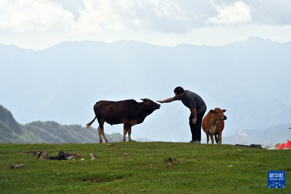 在融水苗族自治县杆洞乡尧告村高山牧场,游客给黄牛喂食草料(8月13日摄)。