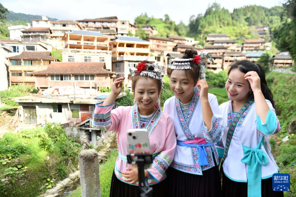 在融水苗族自治县杆洞乡尧告村,几名大学生在准备做直播(8月13日摄)。