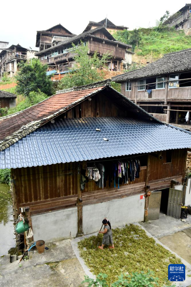 在融水苗族自治县杆洞乡尧告村,村民在晾晒中草药(8月14日摄)。