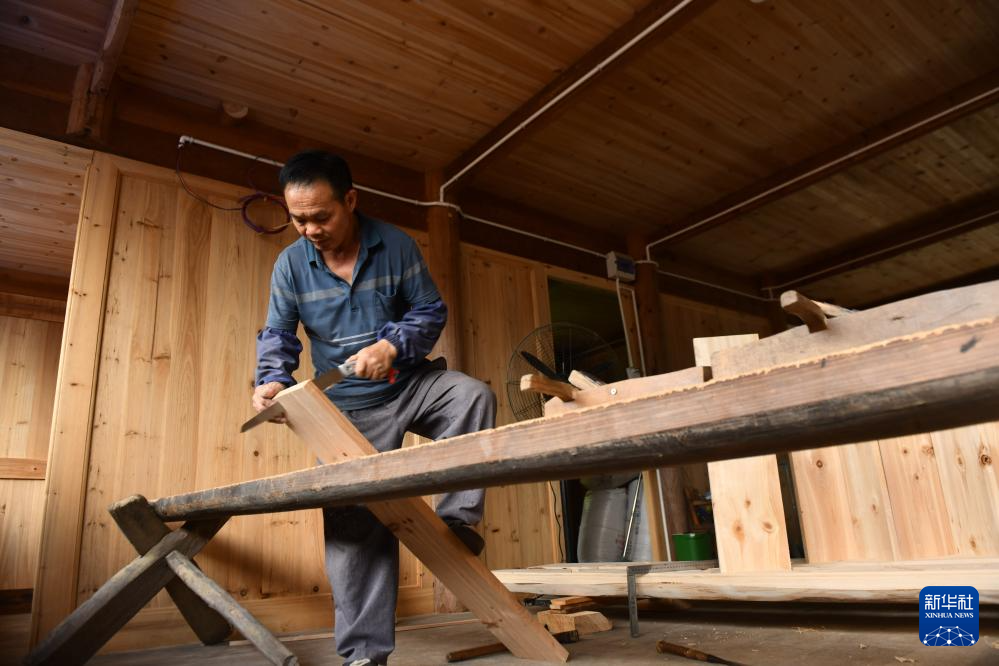 在融水苗族自治县杆洞乡尧告村,木工师傅杨正荣在加工用于装修木楼的木材(8月14日摄)。