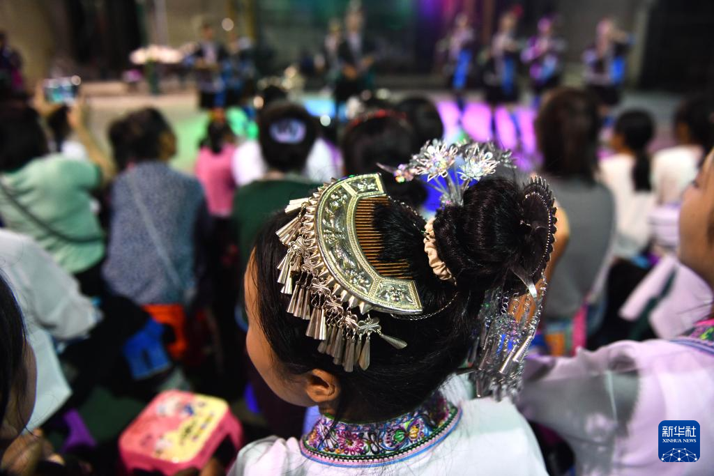 在融水苗族自治县杆洞乡尧告村,头戴精美银饰的苗族姑娘在观看文艺演出(8月13日摄)。