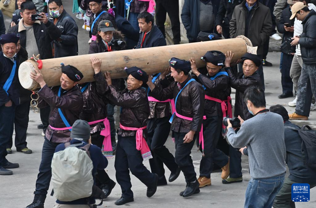 在融水苗族自治县杆洞乡尧告村,村民在拉鼓祈福(无人机照片,2022年12月7日摄)。