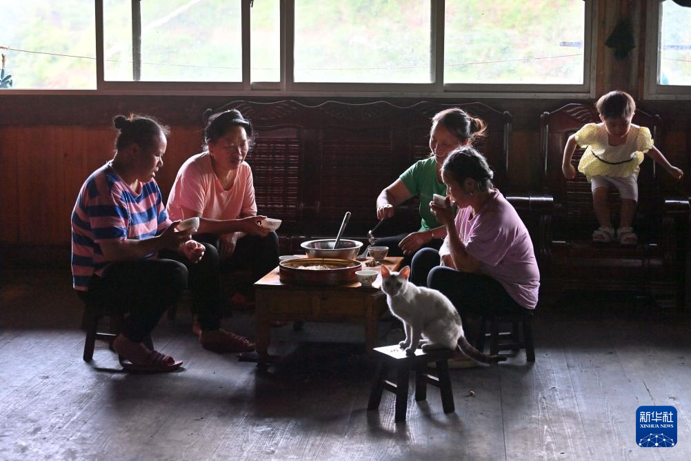 在融水苗族自治县杆洞乡尧告村,村民们在喝油茶(8月14日摄)。