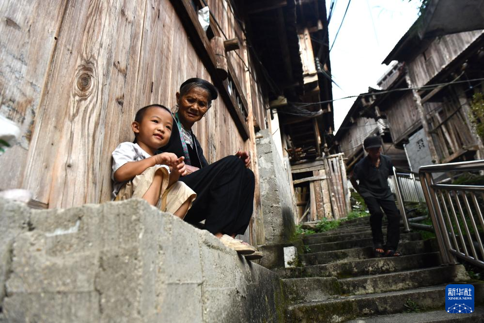 在融水苗族自治县杆洞乡尧告村,75岁的梁妹略老人和孙子坐在路旁休息(8月13日摄)。