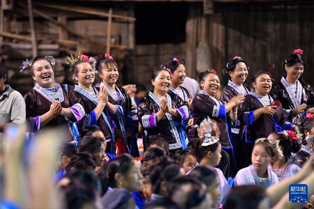 在融水苗族自治县杆洞乡尧告村,村民们在观看文艺演出(8月13日摄)。