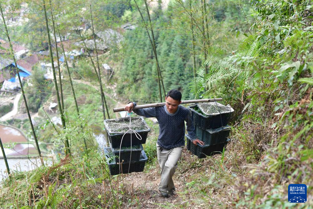 梁秀前挑着果苗上山,准备种植(2018年3月29日摄)。
