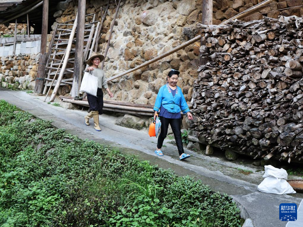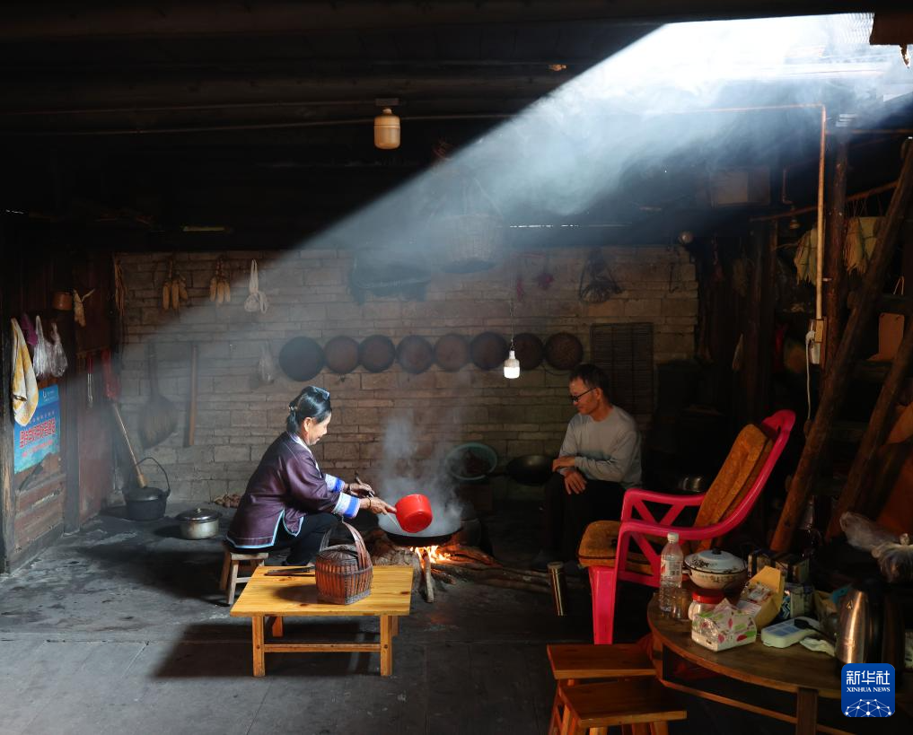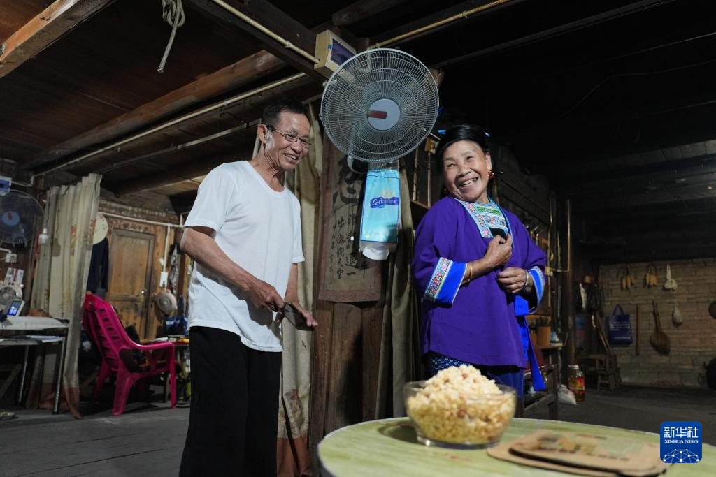 梁安合(左)和老伴梁英迷在乌英苗寨的家中说笑(2024年9月10日摄)。