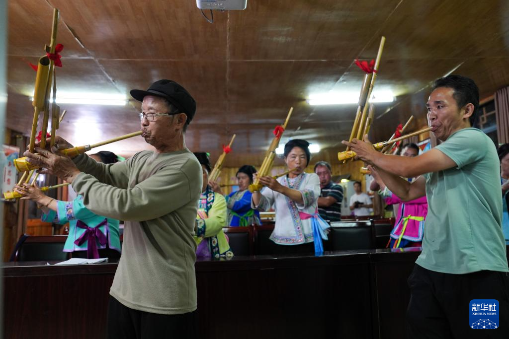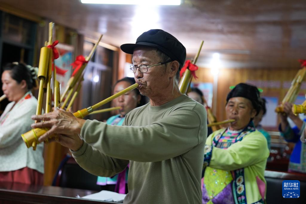 在乌英苗寨妇女夜校,梁安合(右一)指导妇女们练习吹芦笙(2024年9月10日摄)。