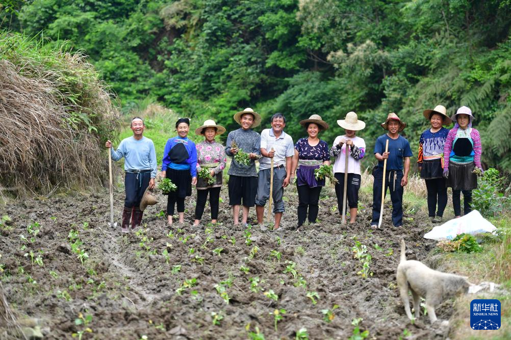 梁安合(左一)和儿子梁秀前(左三)和乌英苗寨联合党支部的其他党员一起开展公益活动(2019年6月30日摄)。