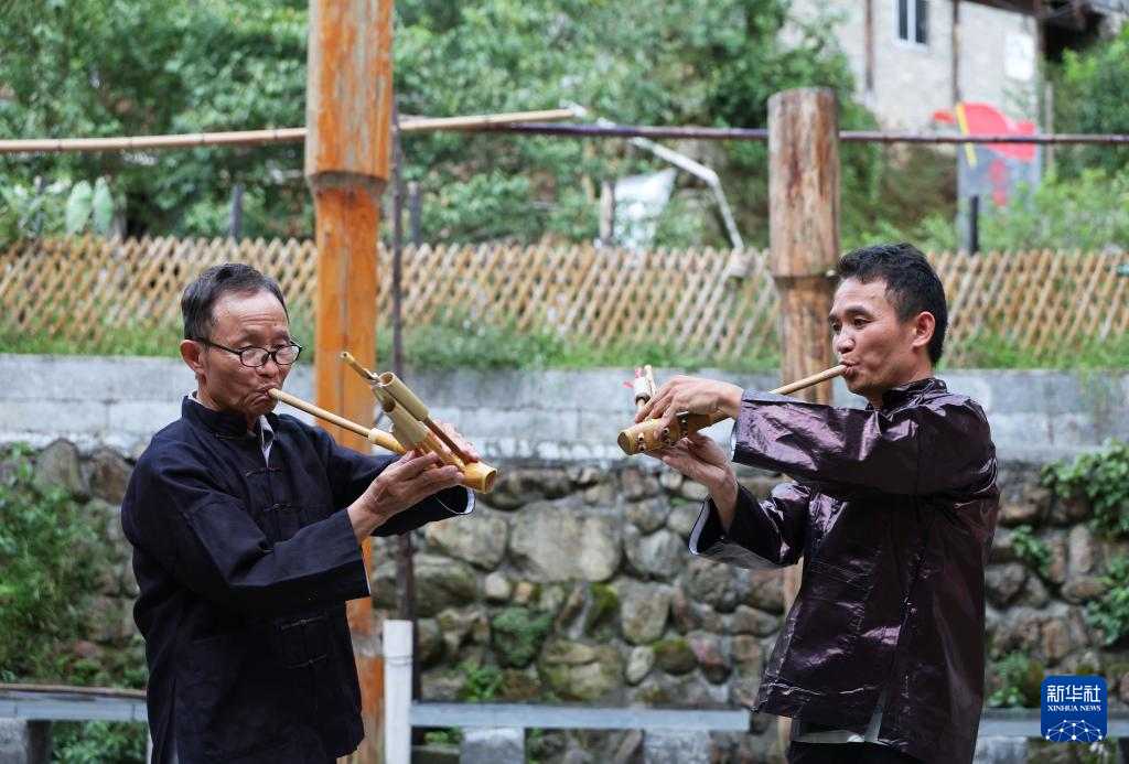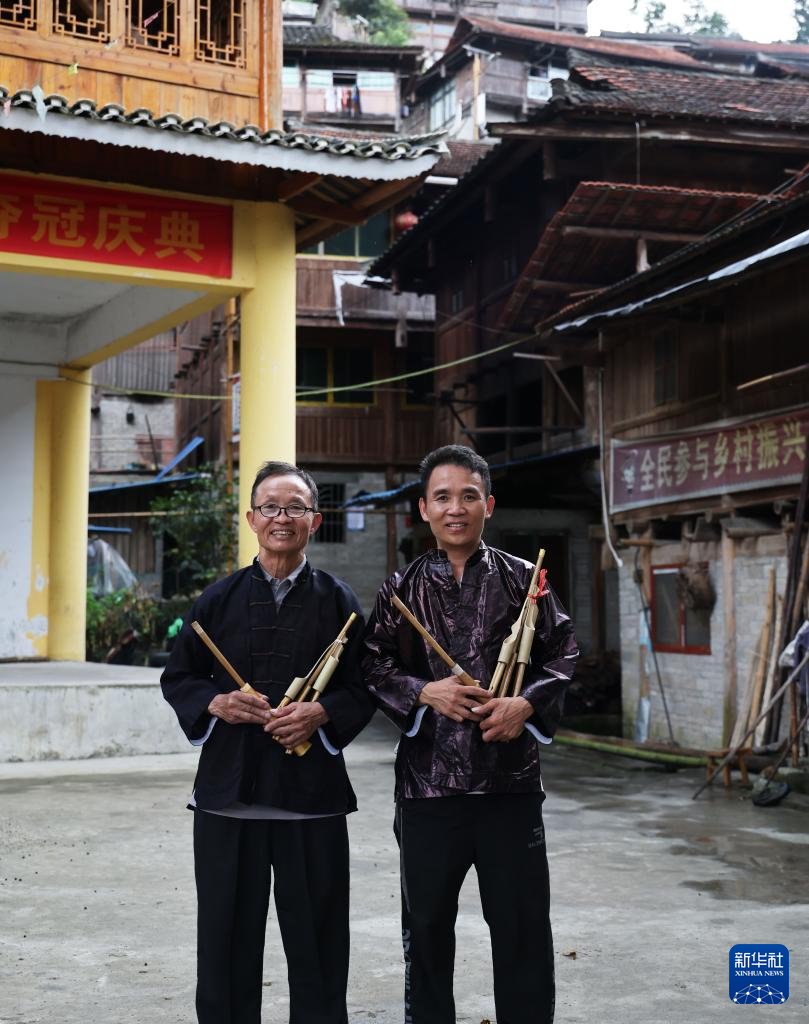 梁安合(左)和儿子梁秀前在乌英苗寨亮布小广场上练习吹芦笙(2024年9月3日摄)。