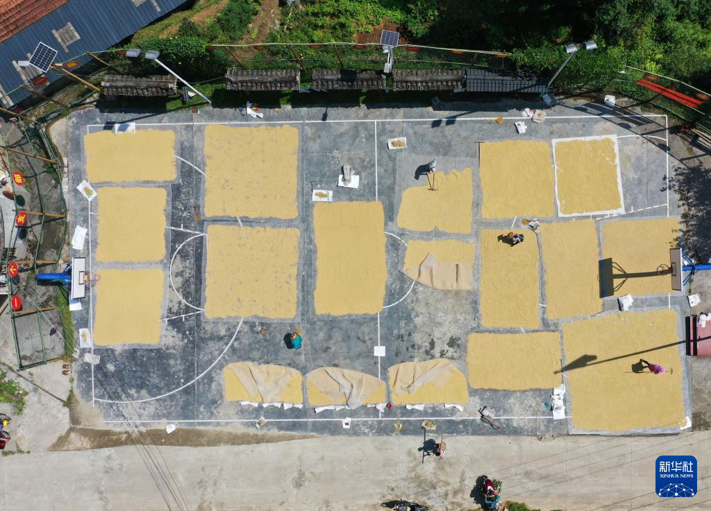 乌英苗寨村民在篮球场上晾晒刚刚收割的稻谷(无人机照片,2024年9月4日摄)。