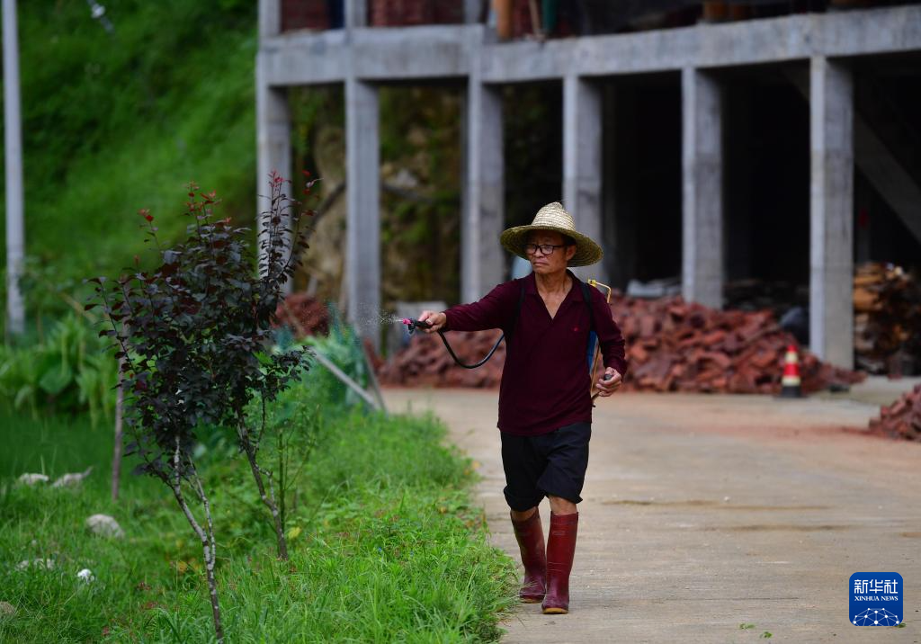 梁安合给树苗杀虫(2020年7月8日摄)。