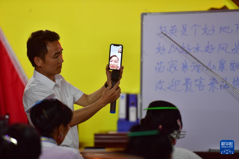 在乌英苗寨妇女夜校,梁秀前用手机与山外的老师连线给妇女们上课(2020年6月22日摄)。
