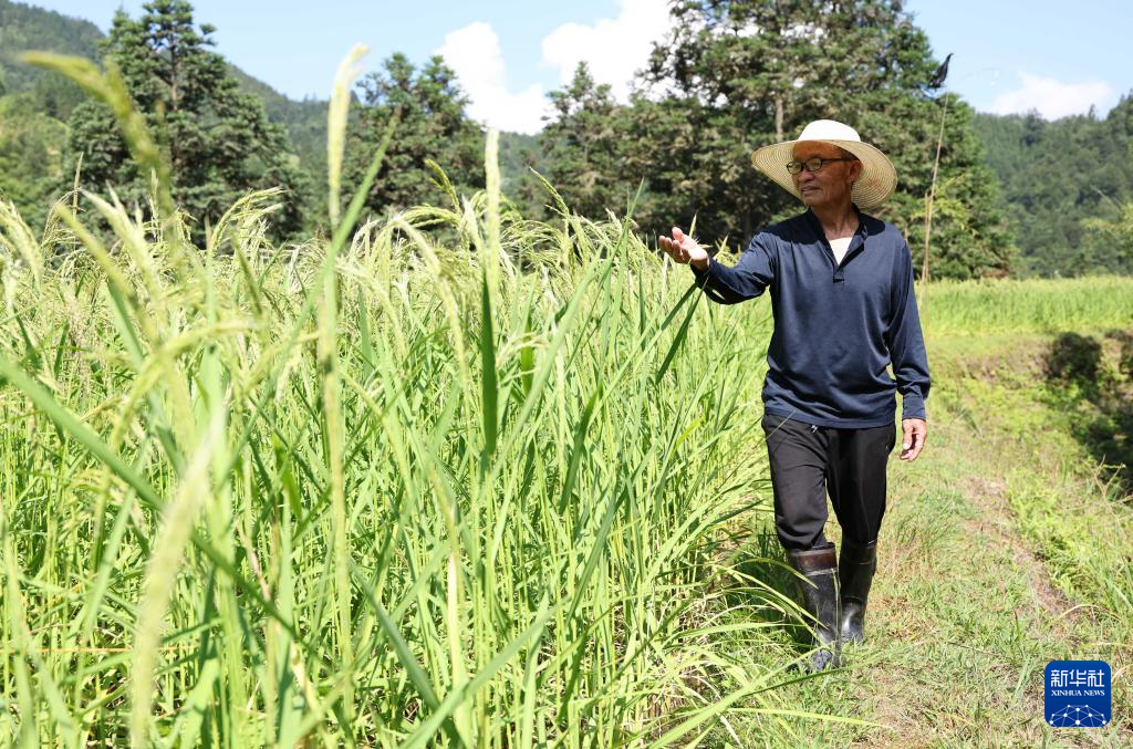 梁安合在田间查看稻谷生长情况(2024年9月3日摄)。