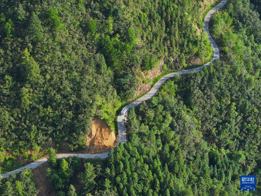 梁秀前驾车在山路上前进,准备到各村寨去送快递(无人机照片,2024年9月5日摄)。