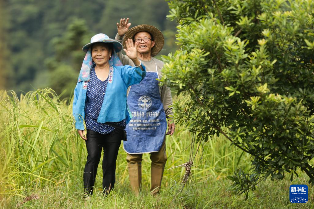 梁安合和老伴梁英迷在田边向记者打招呼(2024年9月11日摄)。