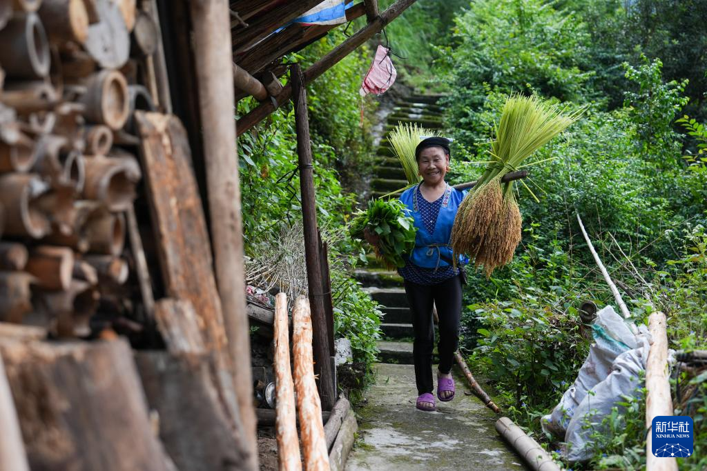 梁安合的老伴梁英迷将稻谷挑回家(2024年9月11日摄)。