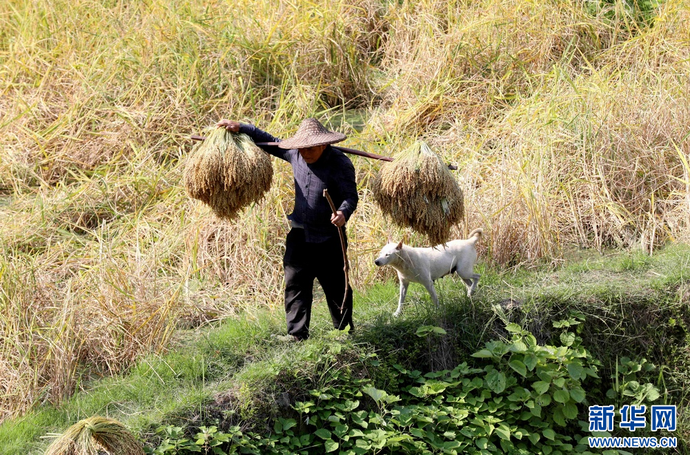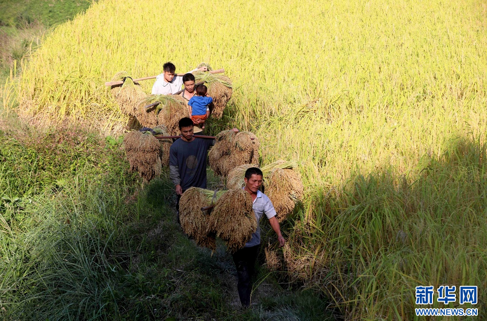 图为村民在抢收糯禾,把禾把挑回家。龚普康 摄