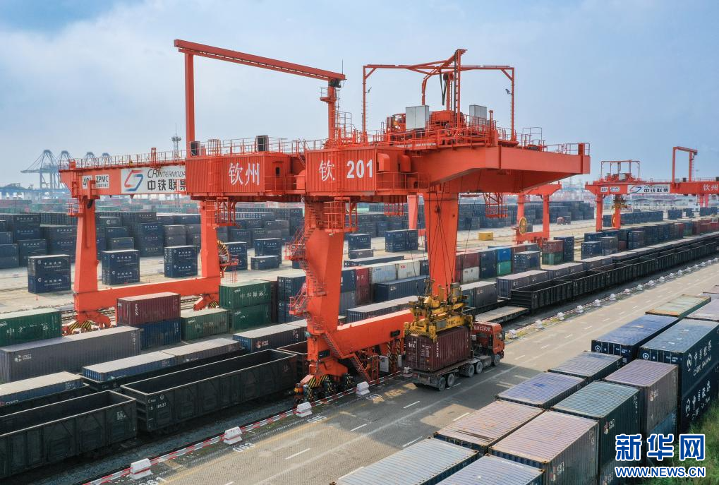 在广西钦州港东站,开往东盟多国的铁海联运班列等待出站(10月20日摄,无人机照片)。
