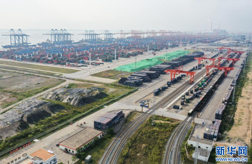 俯瞰广西钦州铁路集装箱中心站,铁路场站和海港码头相互呼应,形成便利的铁海联运(10月20日摄,无人机照片)。