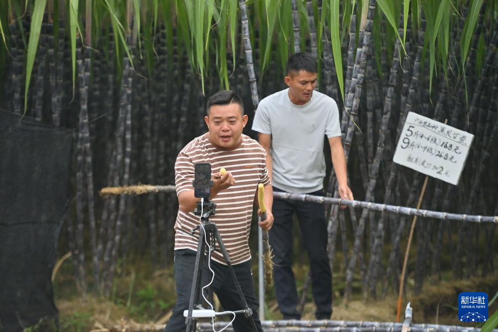 11月3日,在广西柳州市柳江区百朋镇里团村,返乡创业青年黎有晴(左)、梁伟在田间直播卖果蔗。